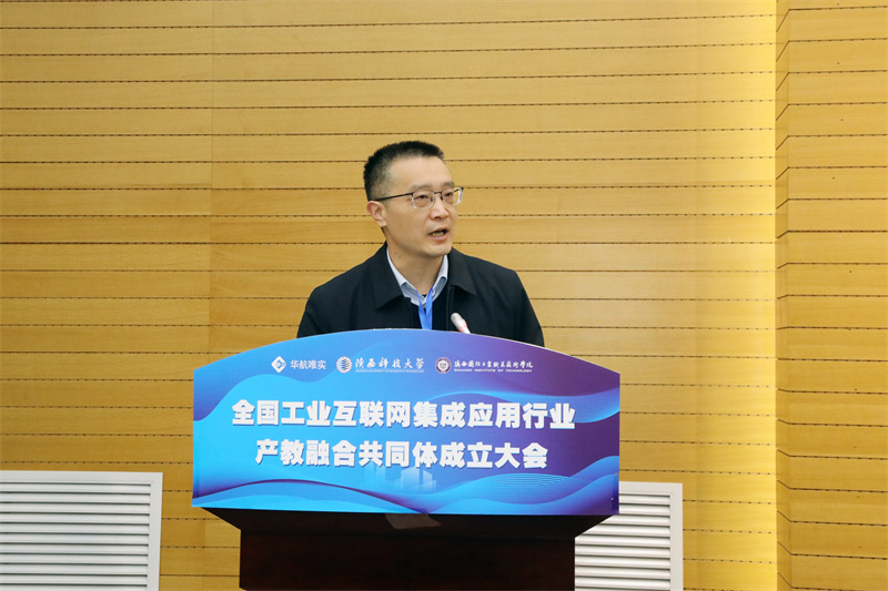 陕西科技大学副校长费贵强致辞。他表示,陕西科技大学作为本次共同体的主要发起单位之一,将充分发挥自身在人工智能与工业互联网领域的学科优势和人才优势,深化产教融合,推动教育链、人才链、产业链、创新链“四链”合一,加强产学研用各方的紧密合作,搭建一个开放包容、合作共赢的平台,促进技术突破和应用创新,积极推动共同体的建设和发展,为我国工业互联网的高质量发展贡献智慧和力量。同时,也期待与各位领导和嘉宾深入交流、共同探讨,共同推动全国工业互联网集成应用行业产教融合共同体的发展,未来,陕西科技大学将继续秉承“厚德博学、笃行至善”的校训精神,为我国工业互联网产业的发展注入新的活力。