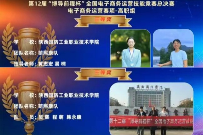 2024年11月25日至29日,第12届“博导前程杯"全国电子商务运营技能竞赛总决赛在线上举行。160所院校的604支中职、高职和本科团队参与了本届赛事电子商务运营和跨境电子商务两个赛项竞技。经过总决赛角逐,我校黄志宏和易楠两位老师指导的程萌、吴熙、韩永康3名同学获得了全国总决赛三等奖。