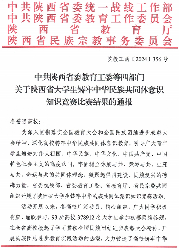 我校荣获陕西省大学生“铸牢中华民族共同体意识”知识竞赛优秀组织单位