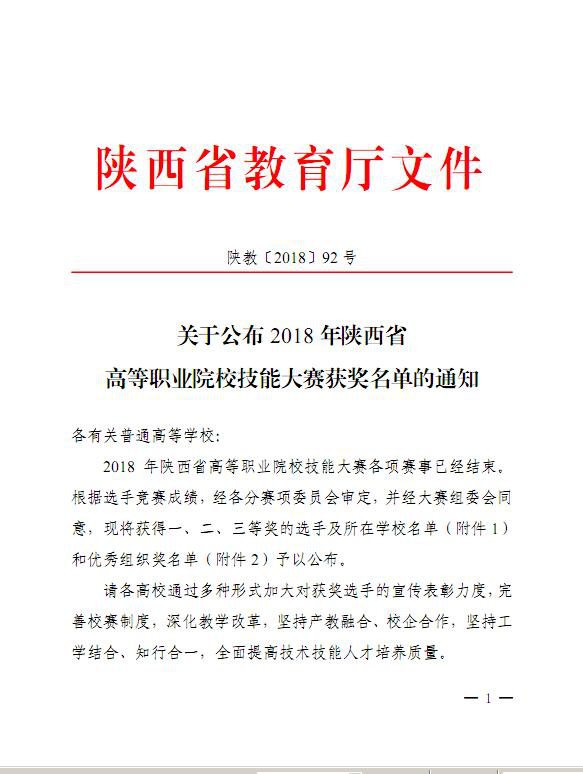 2018年4月28日,2018陕西省高等职业院校技能大赛工作圆满结束,我校荣获由陕西省教育厅公布的2018年陕西省高等职业院校技能大赛优秀组织奖,本次荣誉的取得来源于校领导对大赛工作的全力支持,来自于党政办、宣传处、资产管理处、保卫处、医务所几个职能处室的工作支持,更取决于五个承办分院全体师生的辛勤付出。 2018年陕西省高等职业院校技能大赛共开展赛项58项,我校经过申报,成功获得了7个赛项的承办权,化学工程学院、数控工程学院、机电工程学院、电子工程学院和计算机与软件分别负责7个赛项的具体承办工作,为组织好本届大赛,五个分院的主管领导和全体教职员工筹备20余天,赛事期间接待了来自全省20余所高职院校的参赛队伍,保证了赛事的顺利开展和圆满完成。