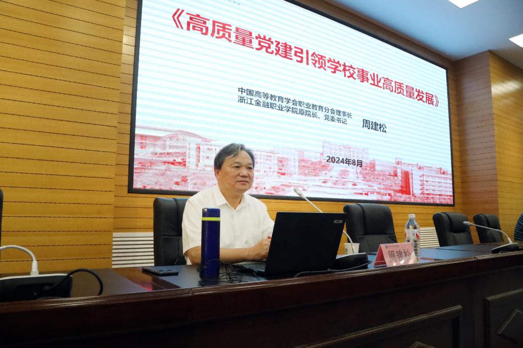 8月20日上午,浙江金融职业学院原党委书记周建松教授做了题为“高质量党建引领学校事业高质量发展”的专题报告,他深入解读了《中国共产党普通高校基层组织工作条例》中关于党的领导与建设规定,分析了党的全面领导与学校重点工作推进过程中学校层面的基本职责、基本任务、基础工作、衡量标准和时代使命,阐释了坚持和加强党委领导下的校长负责制的法律依据、法律法规内涵以及如何实施和体会,分享了党的建设与学校事业发展深度融合的路径以及高质量党建引领大学文化建设与实践等。