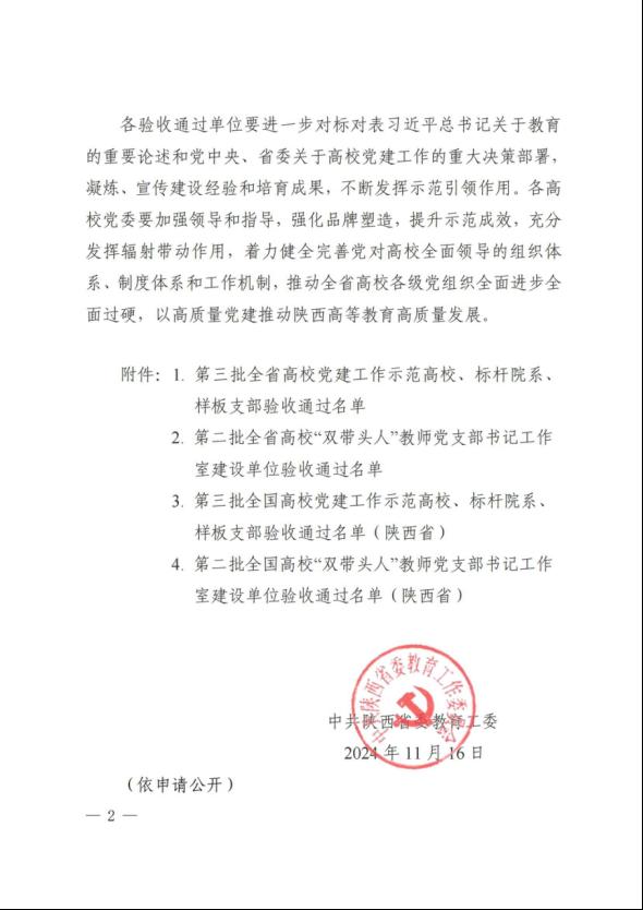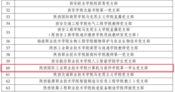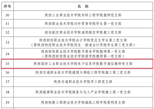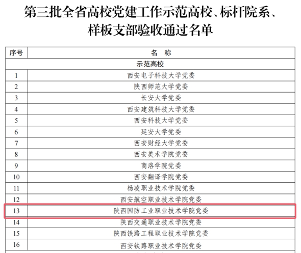 11月16日,省委教育工委公布了第三批陕西高校党建示范创建和质量创优工作验收结果,我校电子信息学院数字通信教师党支部顺利通过第三批全国高校党建工作“样板支部”培育创建验收,校党委、人工智能学院党总支、计算机与软件学院第一学生党支部顺利通过第三批全省高校党建工作“示范高校”“标杆院系”“样板支部”培育创建验收。