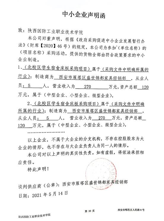 附:西安市雁塔区盛世锦都家具经销部中小企业声明函