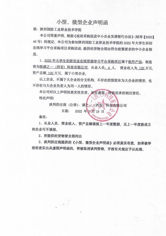 附:课之一(西安)科技有限公司中小企业声明函