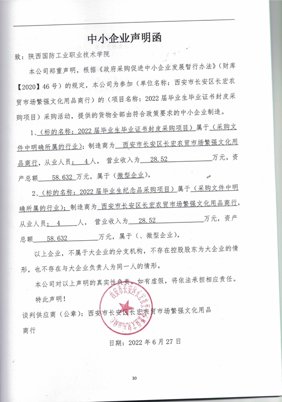 附件:西安市长安区长宏农贸市场繁强文化用品商行中小企业声明函