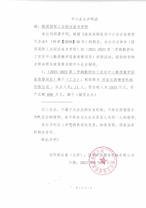 附件:西安北鼎精密机械有限公司中小企业声明函