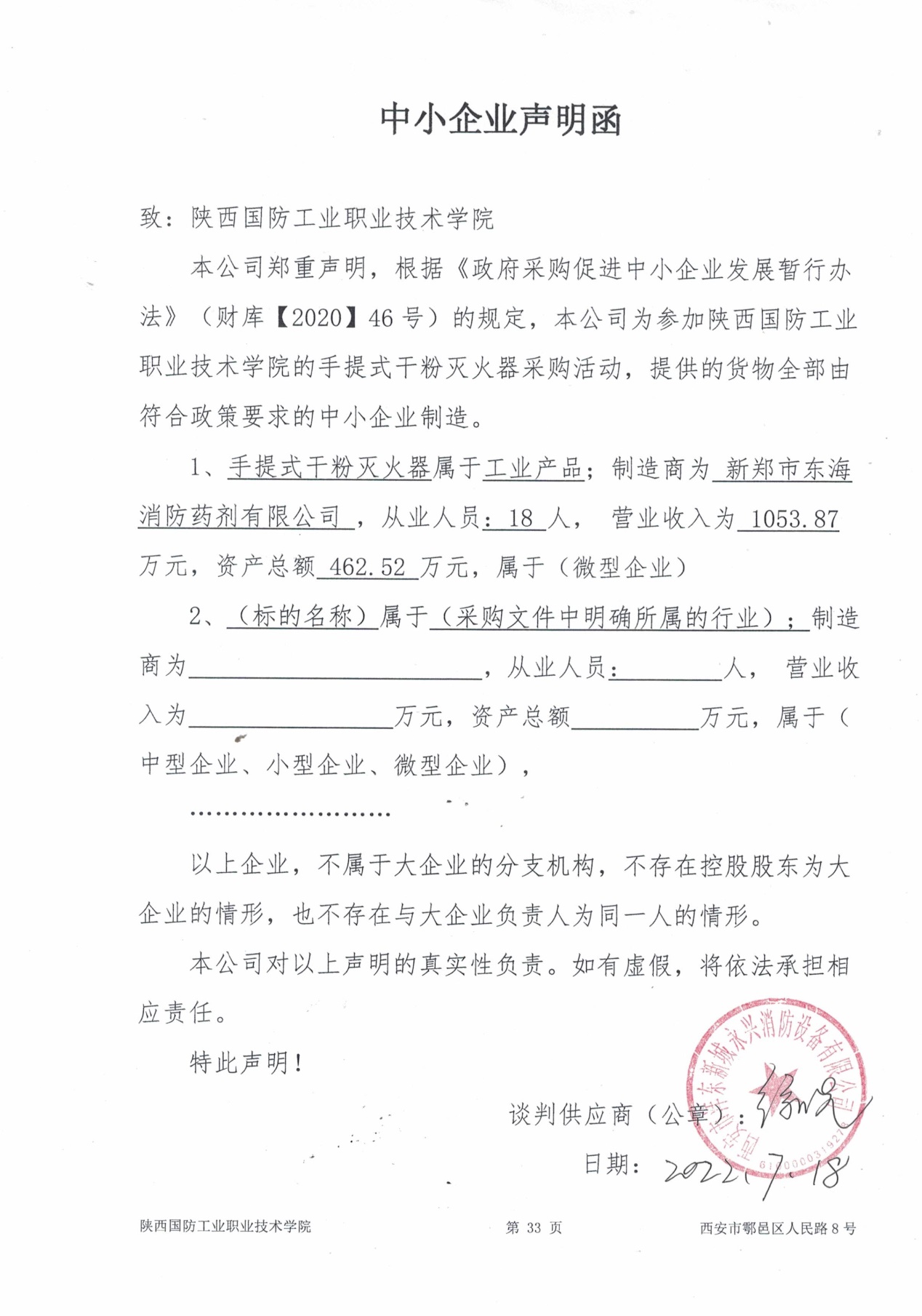 附:西安市沣东新城永兴消防设备有限公司中小企业声明函