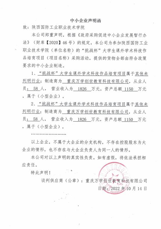 附:重庆万学创世教育科技有限公司中小企业声明函