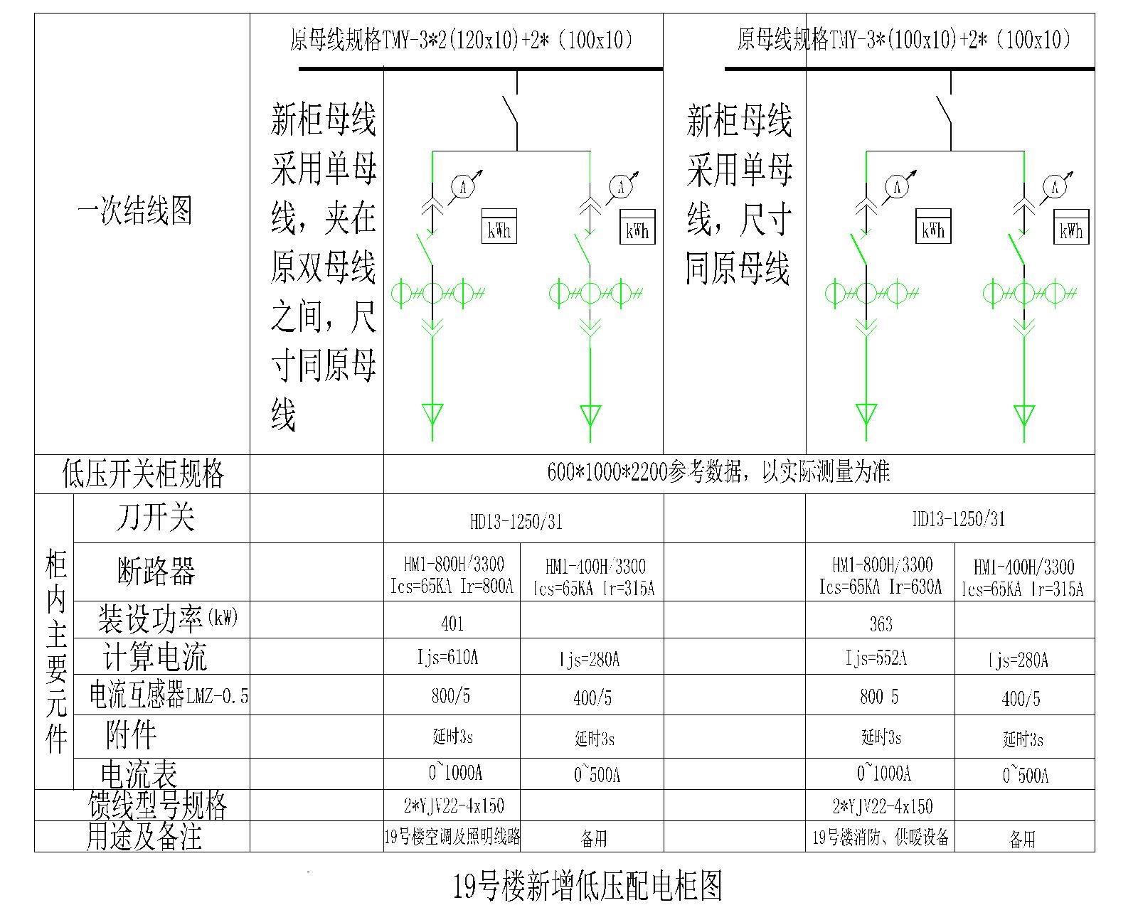 1)北校区变配电所3号变压器低压馈线柜组新增低压柜一台,与原配电柜母线并联,柜内设备要求见附图;