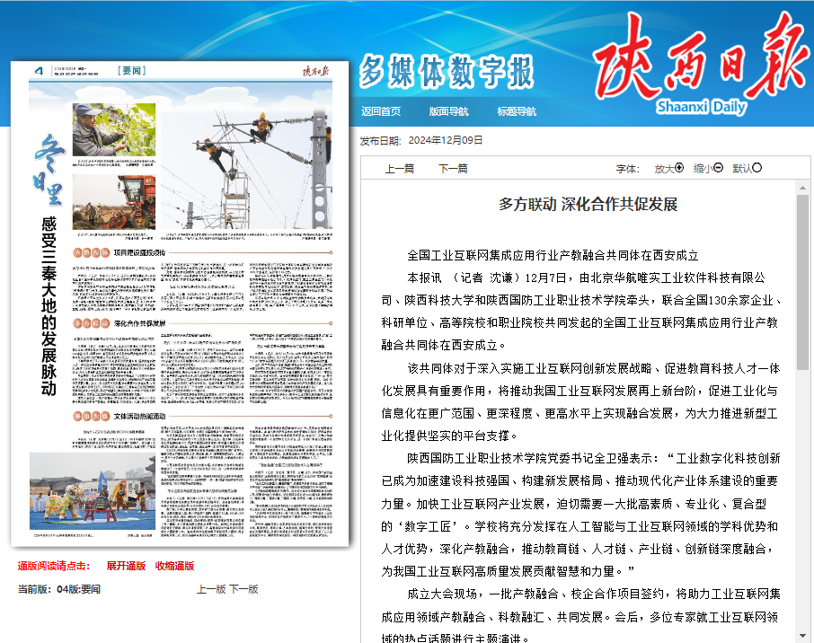 12月9日,陕西日报4版,报道我校牵头成立“全国工业互联网集成应用行业产教融合共同体”。