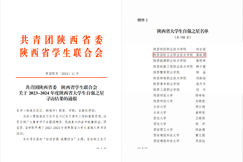 4月3日,由团省委、省学联开展的寻访2023-2024年度“陕西省大学生自强之星”活动结果揭晓,我校学生晏铁男荣获“陕西省大学生自强之星”荣誉称号。