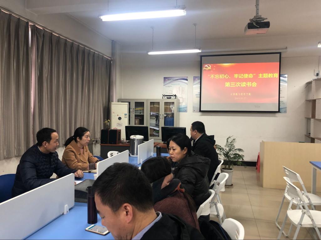 2019年11月27日下午,计算机与软件学院在8-503开展“不忘初心 牢记使命”主题教育第三期读书会,党总支书记潘冬以及各位教师党员参加了此次活动。
