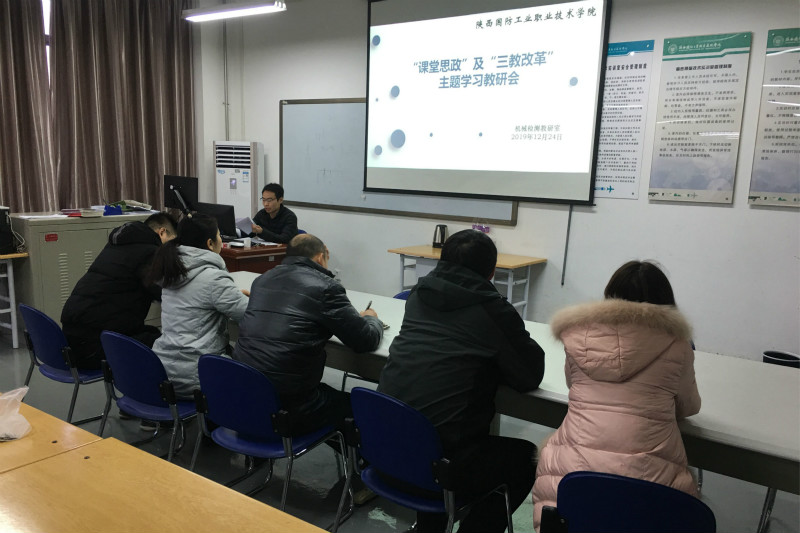 2019年12月24日,机械产品检测检验教研室在十号楼204召开了围绕“课堂思政”和“三教改革”主题开展教研学习活动。会议由质检教研室主任党威武主持,机械工程学院副院长沈博及质检教研室全体专兼职教师参加,会议进行过程中,党老师紧紧抓住本次教研学习主题,带领大家分别学习了《教育部关于印发孙春兰副总理在全国深化职业教育改革电视电话会议上的讲话的通知》《深化“三教”改革 提升技术技能人才培养质量》《新形态一体化教材研究与开发》《<人民日报>:深刻认识“课程思政”的时代价值》《课程思政的价值内涵与实践路径探析》等文件,学习后,沈院长发表讲话:质检教研室各位教师要注重将各科教学中专业知识与思想政治教育内容之间的关联性,并在课程开展的过程中,将思想政治教育的相关内容融汇于学科教学当中,通过学科渗透的方式达到思想政治教育的目的。此外,针对“三教改革”学习问题,要重点加强师资队伍建设、健全双元育人机制,改革教师培养培训以及团队建设等制度、提高教师素质能力、完善双师队伍结构。党老师发言表明,要认真贯彻党中央、国务院关于职业教育的决策部署,积极响应实施《国家职业教育改革实施方案》中的相关政策。