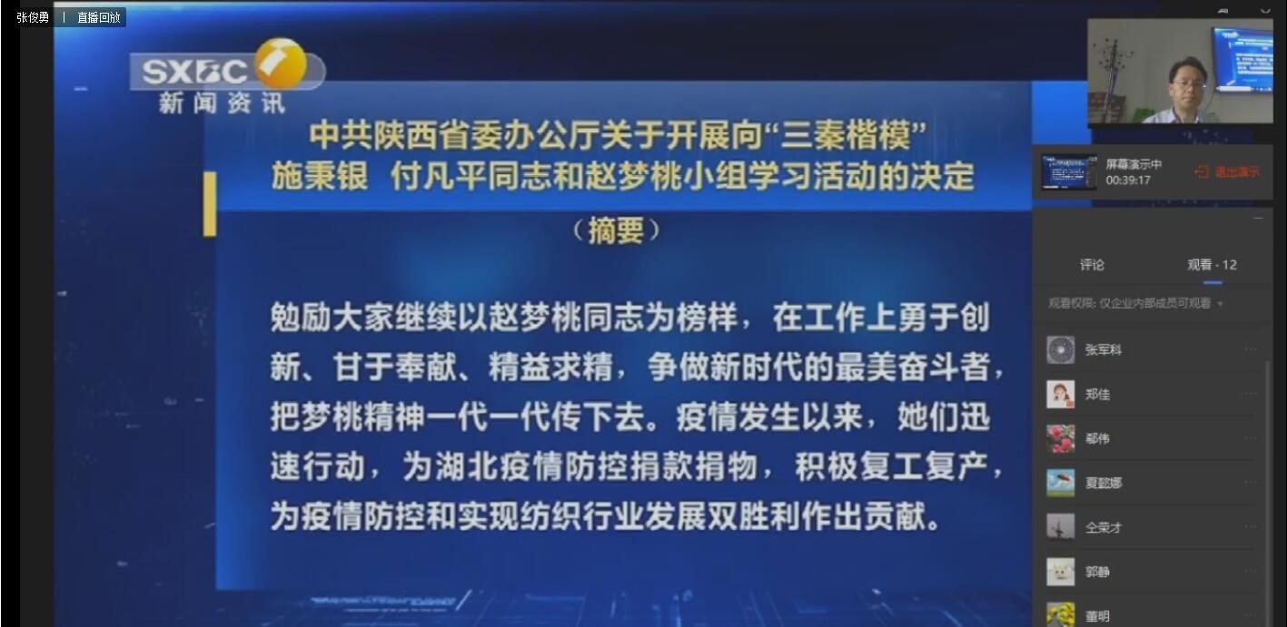 接着教学管理党总支组织教职工学习了“三秦楷模”施秉银、付凡平同志和赵梦桃小组先进事迹,通过认真学习,大家表示要坚守初心使命、舍身忘我、矢志奉献的崇高境界,恪尽职守、埋头苦干的朴实作风,勇于担当、冲锋在前的拼搏精神,关键时刻能够站得出来,危急关头能够顶得上去,在当前疫情防控和复课复学的新形势下,牢记初心使命,坚定理想信念,认真履职尽责,确保学校教学各项工作正常有序开展。