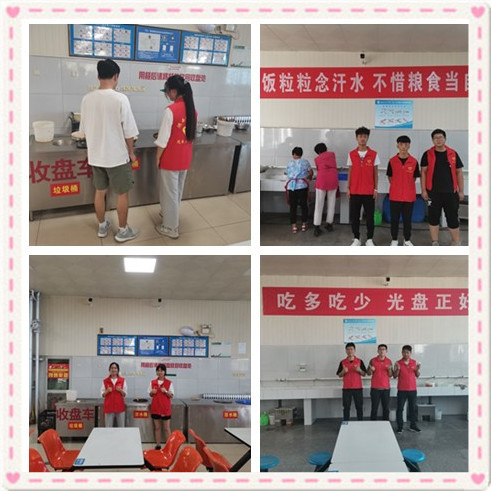 在活动举行之前,各班级开展了主题班会就如何开展光盘行动进行了讨论,每个人都积极发言提出自己新颖的想法,并在活动前精心策划将活动必备的东西准备完成。9月8日下午,志愿者们整装待发,在食堂门口张贴海报,放置了若干个写有关于光盘行动标语。活动中大家身着红马甲,头戴小红帽,在餐厅收餐台帮助保洁员收拾餐具,用一些幽默的语言在同学们用餐的过程中不断提醒大家不要剩餐。10余名志愿者们带着热情饱满的状态积极参加了这项活动,在各自的任务岗位上认真的完成着自己的任务,宣传光盘的意义和利处,用自己的方式来传递正能量。