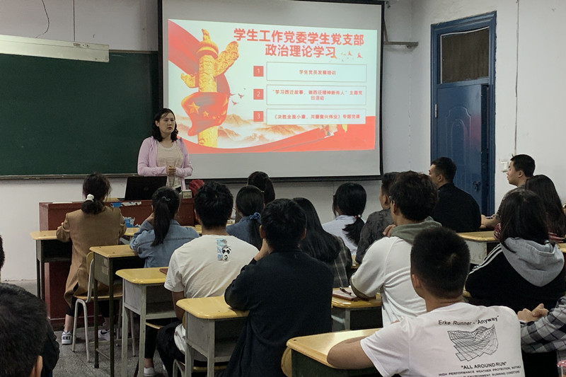 宣传委员贾琬朝首先介绍了学生党员发展的相关流程。强调了入党的严肃性以及需注意的事项。组织委员李月娇带领学生党员一起学习了西迁故事,讲述了西迁精神。她勉励同学们要做西迁精神的新传人,要不忘初心、牢记使命,抓住新时代机遇,到祖国最需要的地方建功立业。