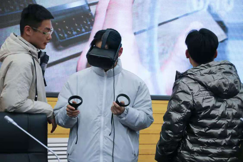 随后,深圳市弋戈软件有限公司谢飞总监就企业概况、企业文化、开发项目、合作单位及公司的人才培养等方面进行了详细讲述。对游戏行业的未来发展趋势、行业人才需求等信息做以说明。并现场展示了企业研发的VR项目,邀请学生代表参与VR项目体验,现场气氛活跃,互动频繁。