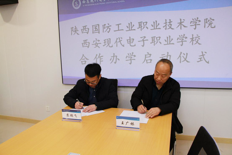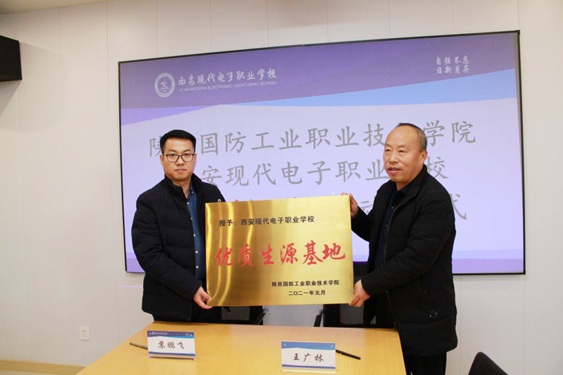 接着,西安现代电子职业学校副校长苏鹏飞与我校就业处长王广林签署联合办学协议,并由王处长为西安现代电子职业学校授牌“优质生源基地”牌匾。