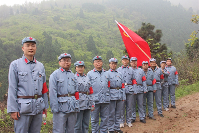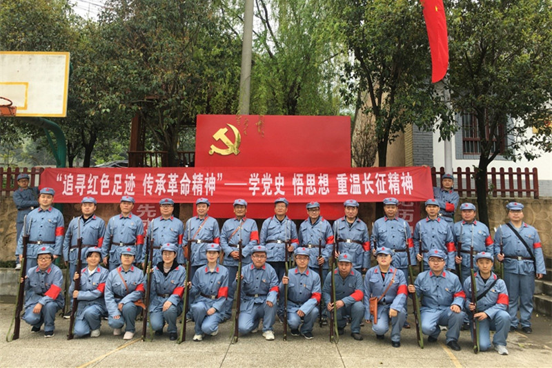红色长征路,全体党员雨天重走当年红军路,感受红军长征的不易,在泥泞的道路中学习红军不畏艰难险阻的英勇精神。