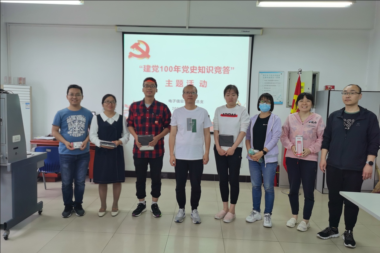 2021年是中国共产党成立100周年,百年风雨,初心如磐。为喜迎建党百年华诞,号召电子信息学院全体党员学习党史,了解建党百年来的光辉历程和实践创新成果,不断增强全体党员热爱党组织、坚定跟党走的决心,5月25日16:50分,在8-403电子信息学院党总支举办了“建党百年党史知识竞答”活动。