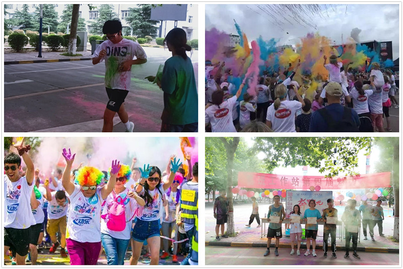 下午17时,热情洋溢的同学们,在四号宿舍楼下参加活力彩跑,随着一声哨响,同学们狂野般的冲向终点,校园里成了色彩和欢乐的游乐园,他们开心地互相抛撒彩虹粉,相互打闹,一路欢声笑语。每一个站点的工作人员向参与者撒彩色粉末以表祝贺。