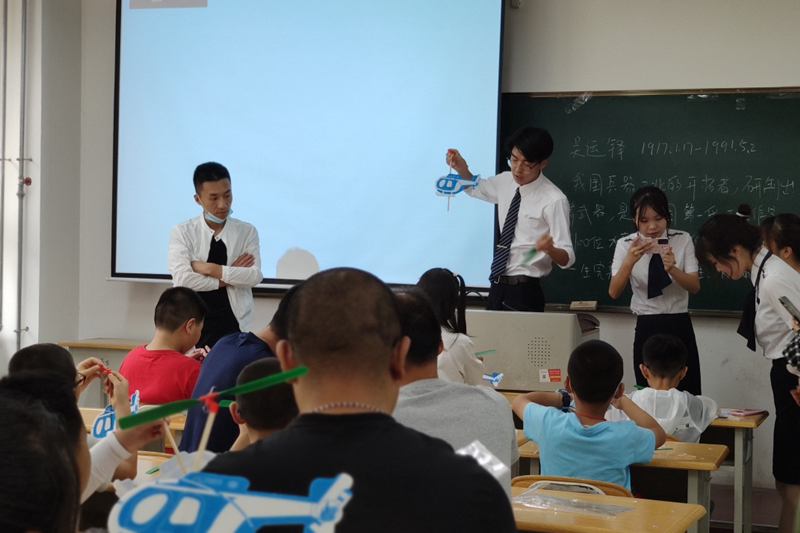 最后,展馆志愿者给小朋友们示范讲解了飞机模型的制作流程,最后带领大家在励剑广场进行了试飞。