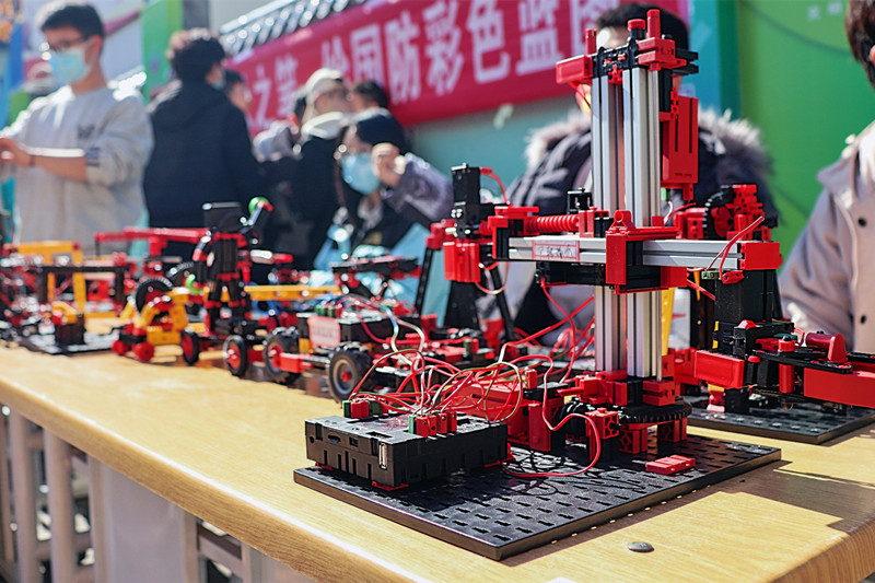 新颖、独特的科技展品陈列在餐厅广场的展台上,作品种类丰富,制作精良,具有较高的专业性和艺术美感,使同学们大饱眼福。同学们各展所能,经过大家的精心设计与创作,制作成了一件件别具匠心,令人赞不绝口的科技小制作作品。其中,路桥协会设计的双桥模型、数控协会的高脚杯、特种加工协会的各类动物、坦克模型、道桥模型、御风航模社的固定翼无人机、火柴创客社的可智能自动控制窗户、电子协会的智能小车和会发光的塔、3D打印协会为庆祝建党一百周年,运用3D打印技术制作的党徽模型、模具设计与制造协会通过校徽产品的结构特征,设计出的注塑模具都给过往的师生留下了深刻的印象。来自各二级分院的作品火箭模型、卫星模型和船舶模型展现了我校国防军工文化的传承。