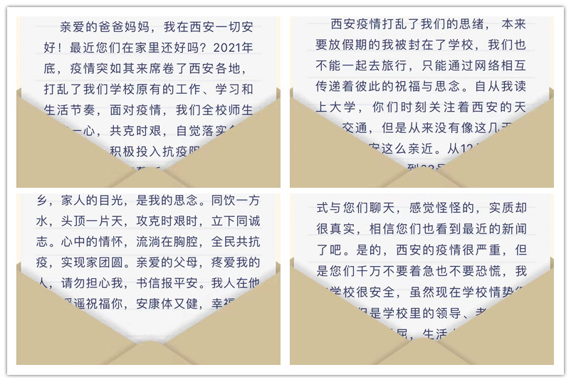 本次通过征集家书,我们看到了青年的担当、学子的思念、抗疫的决心。高乘专业武徐帆同学在信中写到:“‘请党放心,抗疫有我’,在此次疫情中,我时刻牢记自己作为预备党员的身份,处处工作冲在前,与同学们守望相助、并肩抗疫,筑牢疫情‘防火墙’,坚决阻断疫情向学校蔓延,为同学树立了模范带头作用,同时也没用辜负您们对我的期望。”从中,我们看到了青年的责任和担当,抗疫的坚定决心。