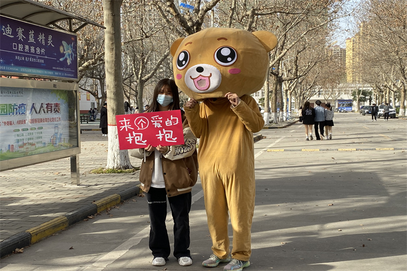 在心愿卡片环节顺利进行的同时,一旁易班熊“爱的抱抱”环节也在火热进行中,易班熊作为易班发展中心的“代言人”受到国防女生们的喜爱,女生们纷纷上前和易班熊互动,活动现场瞬时热闹了起来。