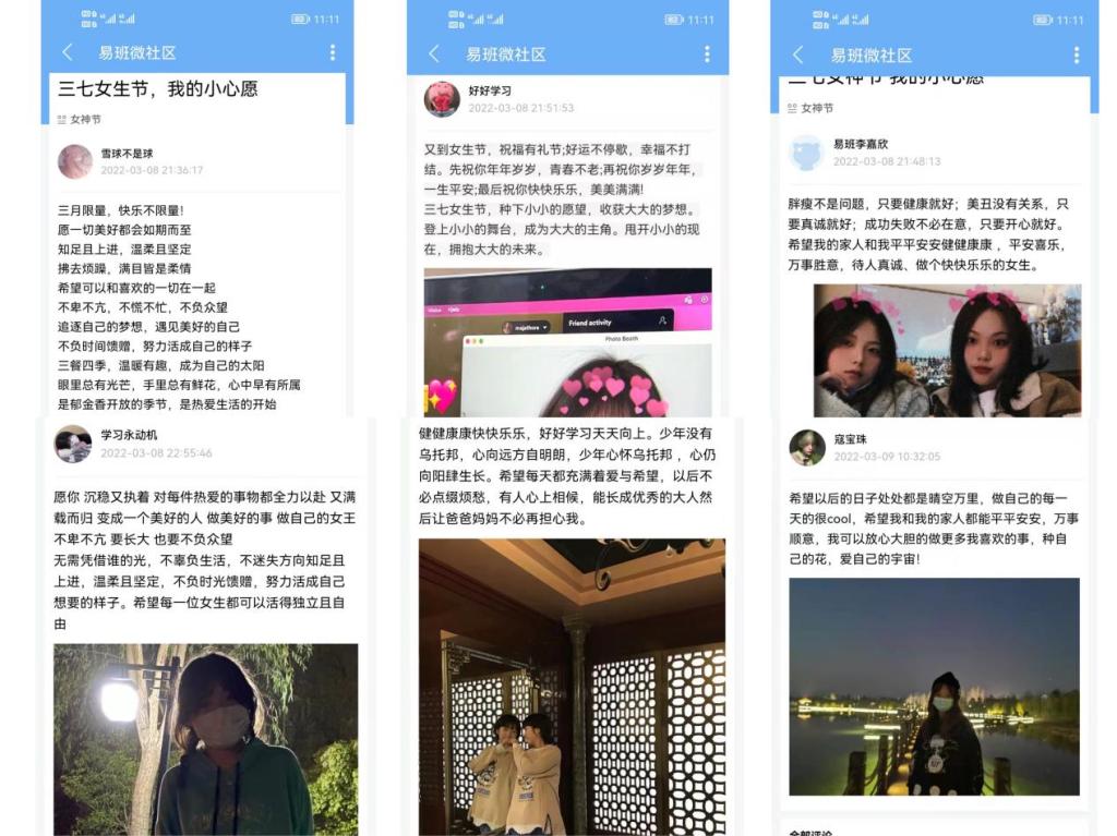 除了线下活动之外,国防女生们在易班平台上也积极参与,展示了自己的青春影像、对未来的美好憧憬以及对自己的真挚承诺。此刻,易班平台微社区上记录了国防女生的自身风采,吸引了学院广大同学们的互动,增进了同学们之间的友谊,营造了积极向上、热血青春、精彩纷呈的校园网络文化氛围。