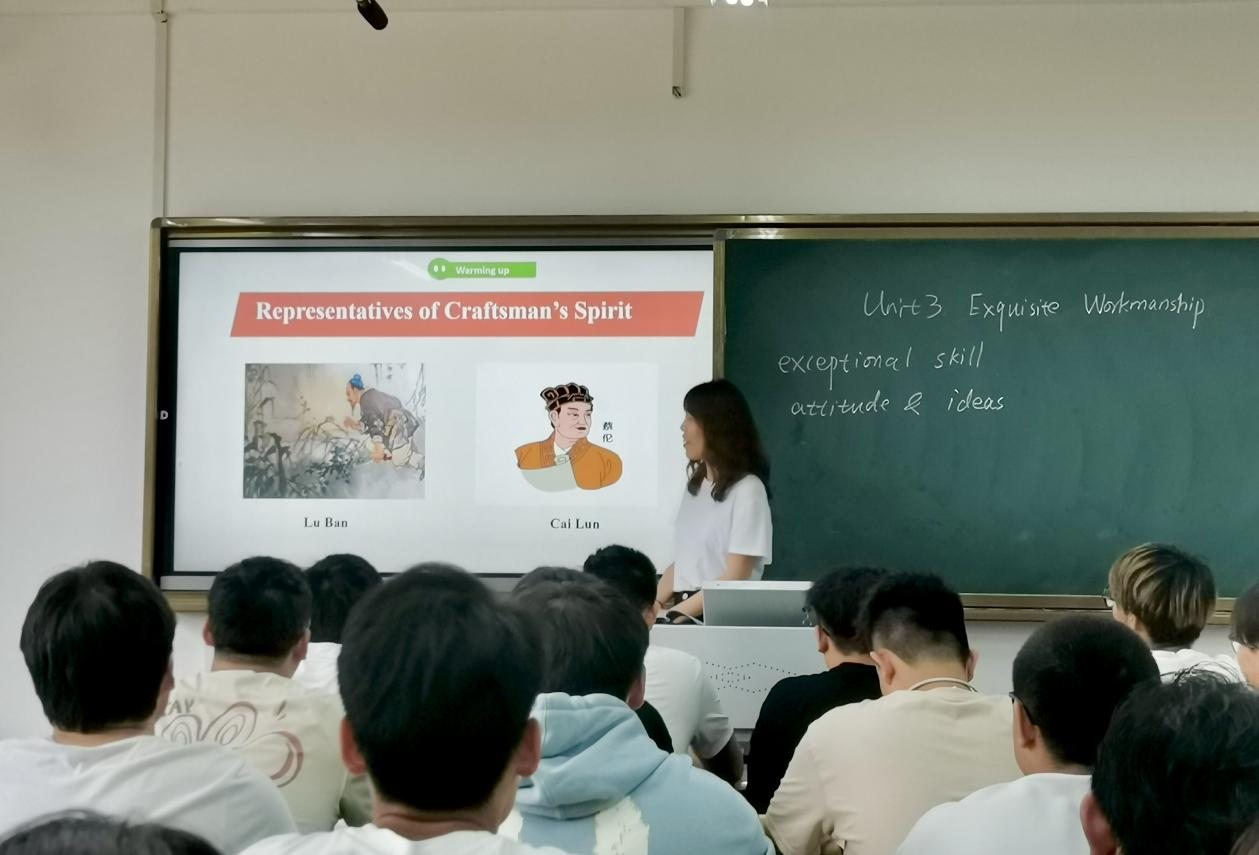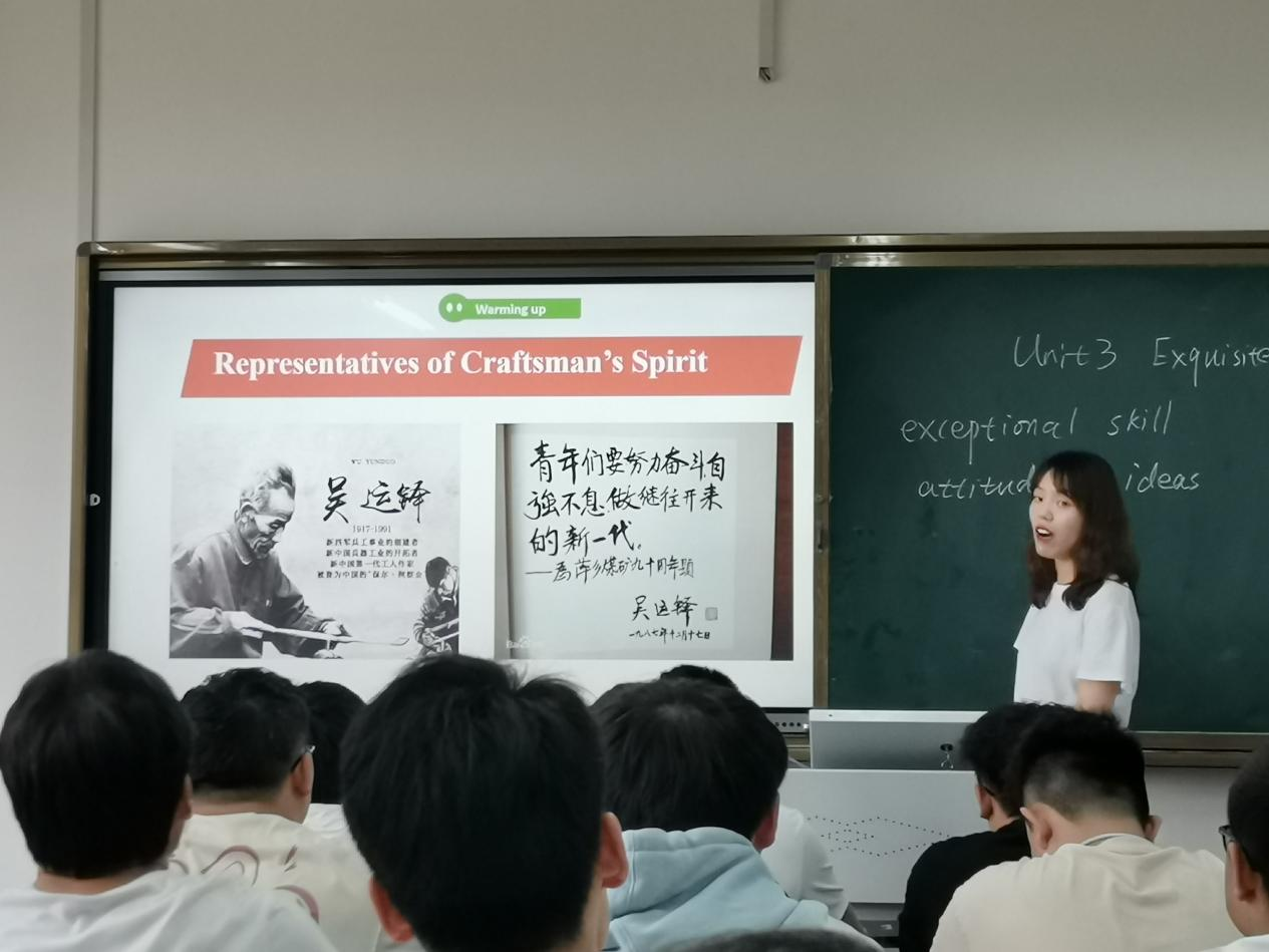 王婷老师上课声音洪亮,精神饱满,充满激情带大家走入英语的世界,充分展现了青年教师的活力与风采,教学效果良好。本次课上,王婷老师从古代故事到现代军工强将,将学生们引入大国工匠的世界,使同学们深入了解到关于工匠精神内涵的英语表达。一个个鲜活的例子,在课堂上形成了非常良好的互动效果。一步步的强化记忆,使同学们能在课堂有限的时间内更充分地掌握所学的内容。