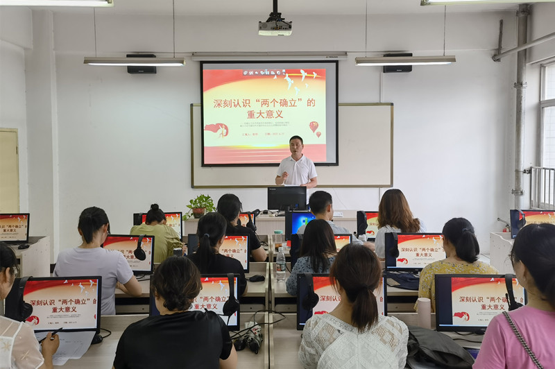 2022年6月23日下午,基础课党总支书记权华在北校区语音室为基础课党总支全体党员上专题党课。专题党课以《深刻认识“两个确立”的重大意义》为题,围绕政治保证、思想指引、奋进力量、组织优势等四个方面展开讲述,要求全体党员同志要提高政治站位、统一思想认识,深刻领悟“两个确立”的重大意义,不折不扣的贯彻落实党的号召、部署和要求,立足教育教学工作实际,以实际行动迎接党的二十大胜利召开。