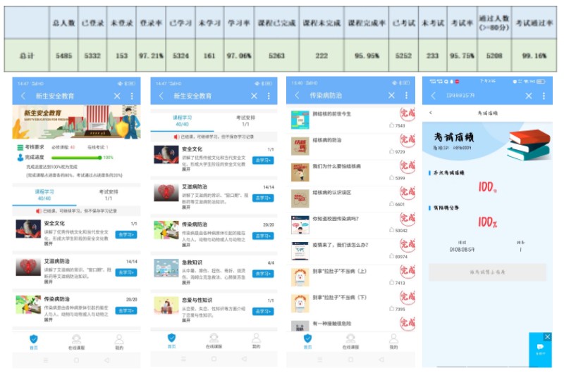 为提升2022级新生的健康安全防范意识与能力,营造健康、安全、文明、绿色、和谐的校园环境,党委新利体育官方网站部易班发展中心于2022年08月25日至2022年10月20日,在2022级学生中开展易班新生安全教育学习活动。本次学习我校共5485名学生线上参与,考试通过率达99.16%,其中登录率、学习率、课程完成率、考试率均达到95%以上。
