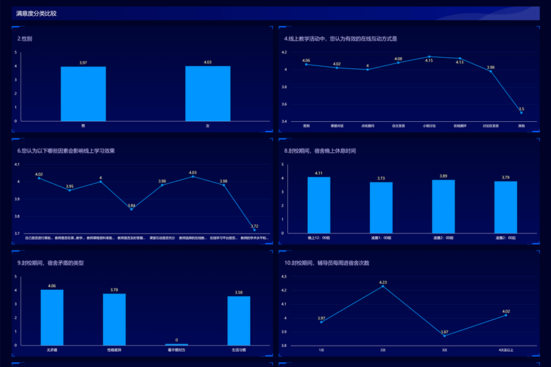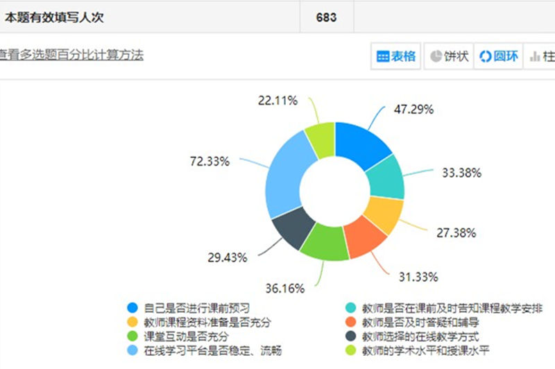 调研活动开展,掌握教师教学效果。经济管理学院利用问卷星、班主任进宿舍谈心谈话等多种形式,对学生在校教学满意度进行调研,学院683名学生积极参与线上调查,对教师课堂教学形式、教学效果、线上互动形式等教学满意度现状进行反馈,85%的学生对线上教学效果表示满意,大一学生的反馈效果最为积极,也能够提出更多有效建议,为线上教学改革带来了很多参考性思路。
