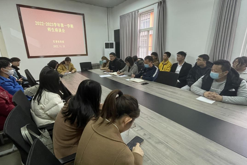 11月15日下午,为深入了解学生在疫情防控下的校园学习生活情况,及时解决学生所关心、关注的问题,保证学生在校的学习生活,军事体育部开展体育工作师生座谈会。本次座谈会由军事体育部办公室主任李娟主持。军事体育部部长王茂利、各二级分院教师代表、军事体育部骨干教师和教师代表以及学生代表参与了本次座谈会。