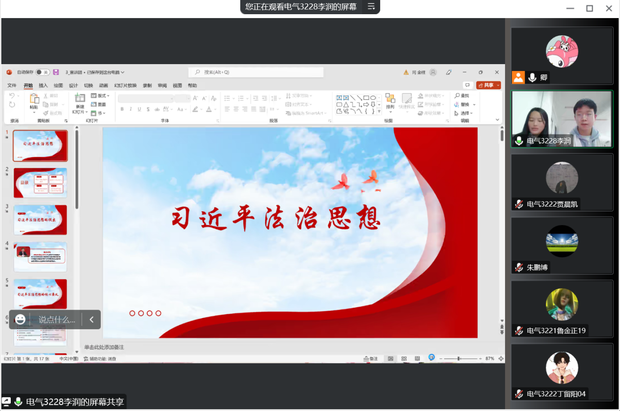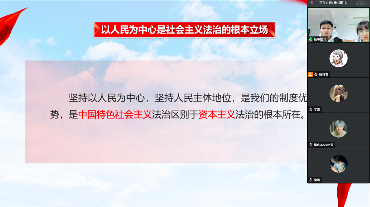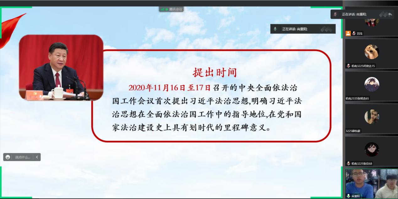 为深入学习贯彻习近平法治思想,扎实有效开展新时代法治宣传教育,培养学生学法、懂法、用法、守法意识,11月29-30日,马克思主义学院组织习近平法治思想大学生宣讲团走进思政课堂,以“线上宣讲”的形式开展习近平法治思想宣讲。