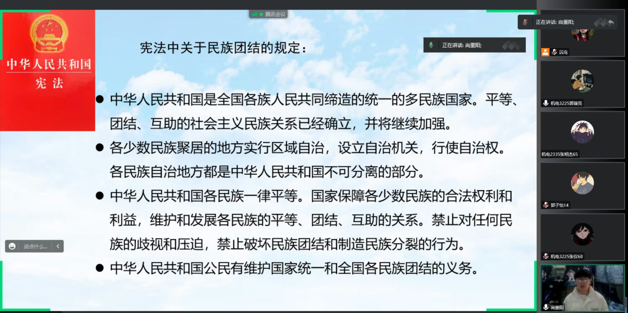 来自土家族的杨江海同学与同学们共同学习《中华人民共和国宪法》当中关于民族平等、民族团结的规定,并且呼吁少数民族同学们能够尊崇宪法、学习宪法,立足自身实际,努力从思想、学习、实践等方面提升自己,坚持中华民族共同体意识,牢固树立社会主义核心价值观,做维护祖国统一和民族团结的践行者。