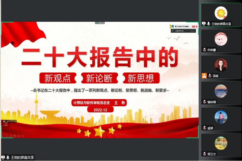 12月6日下午,计算机与软件学院党总支书记为全体党员讲授了“二十大报告中的新观点、新论断、新思想”专题党课。