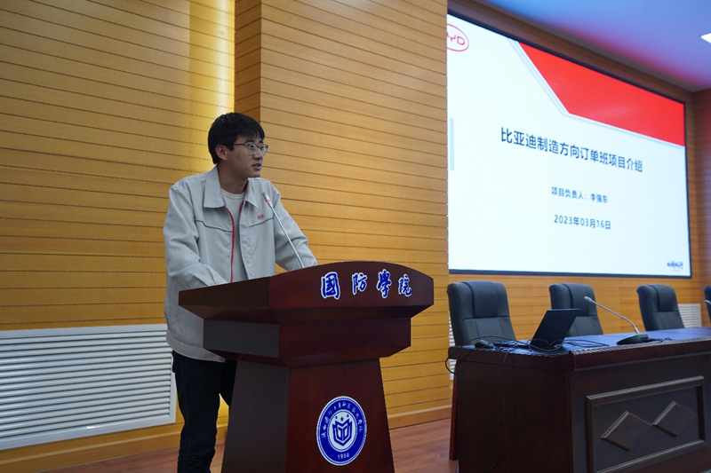 比亚迪十一事业部西安地区校企负责人李强东对比亚迪制造方向订单班项目,从项目背景、学生晋升、入职后的薪资待遇和订单班课程的开设情况进行了介绍。