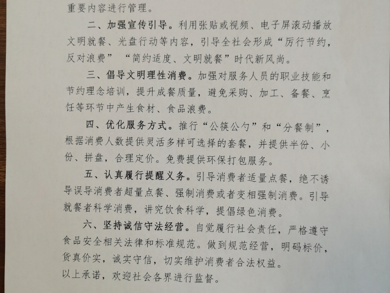 餐饮中心制作了宣传横幅和制止浪费标语、展板海报,向全校师生广泛宣传崇尚文明消费,制止餐饮浪费的良好饮食习惯。组织组织7名餐厅经理签订反餐饮浪费承诺书,开展餐饮从业人员反餐饮浪费签名活动和学生反餐饮浪费签名活动,通过反餐饮浪费签名活动,引导广大学生树立正确食品消费观,增强节约意识,争做理性消费“践行者”。