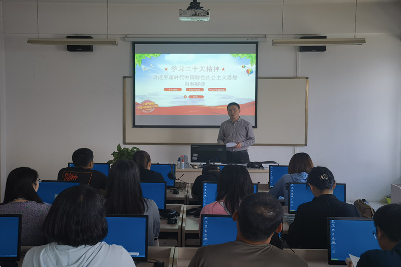2023年6月8日下午,基础课党总支书记权华在北校区语音室为基础课党总支全体党员上专题党课。专题党课以《学习二十大精神》为题,结合学习贯彻习近平新时代中国特色社会主义思想主题教育的要求,围绕“十个明确”“十四个坚持”“十三个方面成就”等三个方面对习近平新时代中国特色社会主义思想内容进行详细解读。