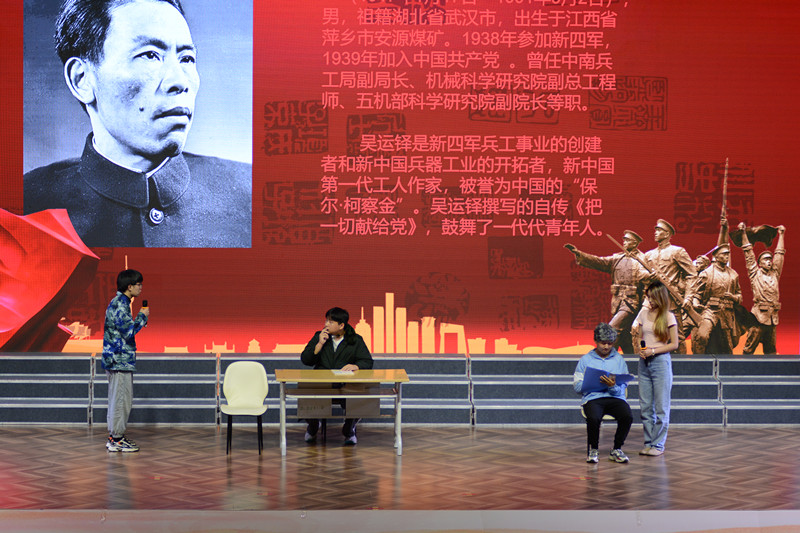 展演现场,光影交替。文艺演出在话剧《军工荣耀,红莲往昔》的精彩表演中拉开了序幕。随后,话剧《信仰青春》、相声《智取威虎山》、动作类《迷彩情怀》等11个精心编排的文艺节目先后上演,给观众带来了一场无与伦比的文化盛宴。剧目片段,将中国共产党的百年奋斗史、抗日英雄慷慨就义、军工英雄吴运铎、军人风采等剧情串联在一起,党的历史、青年故事与舞台演绎融为一体,将一代代青年与党同行、与祖国同行、与人民同行、与时代同行的信念贯穿始终,展现出不同历史时期中国青年坚定信念、团结奋斗、砥砺前行、担当作为的昂扬风采。伴随着欢乐的舞曲,同学们拿起手机或拍照、拍视频,留下精彩的瞬间,还不时敲着节拍,细细品味,情到深处,甚至合着曲调轻轻吟唱。现场时不时响起掌声,高潮不断,带领大家沉浸式体验了一堂生动的大思政课,使红色基因真正融入学生们的血液中。