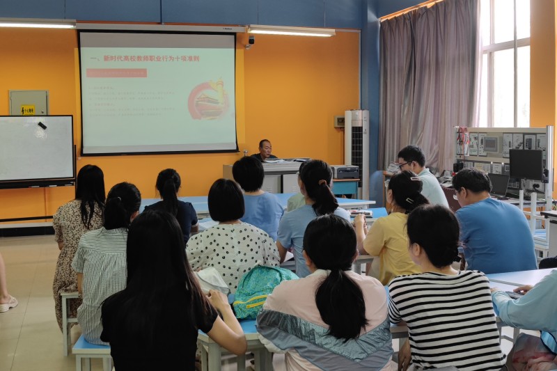深入学习领会习近平总书记关于师德师风建设的重要论述,认真落实新时代教师职业行为十项准则。陕国职教育组发〔2023〕6号文《关于近期主题教育相关工作的通知》要求,人工智能学院全体教师于2023年7月12日上午10:00在8-208开展师德师风专题党课学习活动,本次党课由人工智能学院党总支张双琦同志主讲,人工智能学院院长姜鑫以及全体教师聆听了党课。