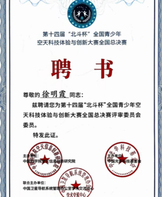 第十四届“北斗杯”全国青少年空天科技体验与创新大赛全国总决赛于2023年10月27至29日在郑州举行,来自全国24个省级赛区的2000余名优秀选手展开了激烈比拼,我校教师徐明霞受邀担任此次大赛全国评审委员会评审专家。