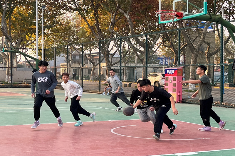 比赛在学校篮球场进行,随着裁判的哨响,整个球场充满紧张的气氛,球员们的激情淋漓尽致的体现在蓝球场上。比赛进程中,各位队员全力以赴,积极防守、积极进攻,越战越勇,显示了他们极佳的心理素质。在场同学也情绪高涨、摇旗呐喊,不时为队员大气喝彩,气氛热烈。赛场上,双方拼抢很激烈,带球、运球、投篮等一系列动作潇洒、规范,引来围观同学一阵阵喝彩。