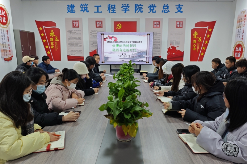 清正廉洁,是中华民族的传统美德,也是中华民族传统文化的重要组成部分。为加强新时代廉洁文化建设,从思想上固本培元,提高党性觉悟,增强拒腐防变能力,扬清廉之风,建筑工程学院于2023年12月22日在2-230召开“崇廉尚洁树新风、砥砺奋进新时代”学生干部廉洁教育主题活动。