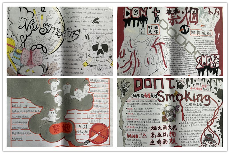 活动利用手抄报,书法文字的形式,向学生宣传香烟带来的危害。通过学生们的创意与热情,广泛传播了禁烟理念,给大家营造了健康良好的学习氛围。引导学生远离烟草,保护身体健康,同时提高了学生的思维能力及健康意识。
