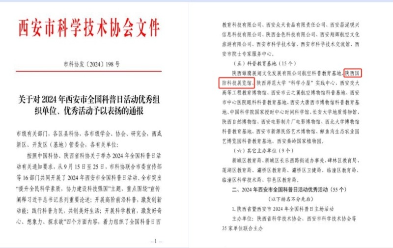 11月4日,西安市科学技术协会下发《关于对2024年西安市全国科普日活动优秀组织单位、优秀活动予以表扬的通报》, 我校国防展馆荣获“2024年西安市全国科普日活动优秀组织单位”。