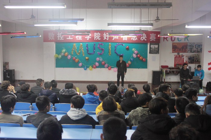 为庆祝改革开放40周年,活跃校园氛围,丰富学生课余生活,提高学生的艺术素养,数控学院于11月15日晚七点在131举办了“数控好声音”决赛。