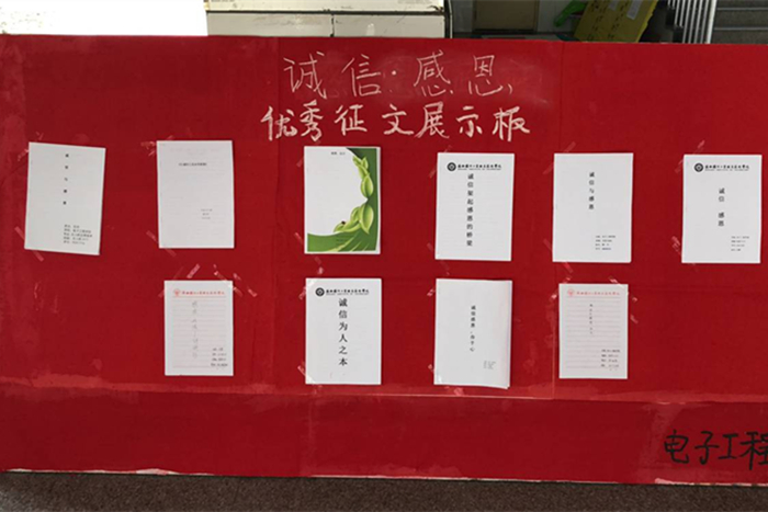 电子工程学院为了广泛宣传国家的助学金及其他的资助政策,进一步提高学生的诚信意识,培育诚信品质,提高文明素养,激发学生的感恩之心,构建诚实守信的校园文化,结合学校实际,于5月份特举办“感恩资助、诚信做人”征文活动。